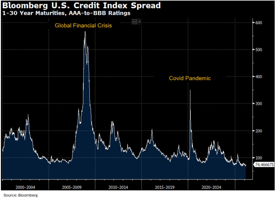 Despite the uptick in volatility and a backdrop of record corporate bond issuance, credit markets have remained resilient. Corporate bond spreads have held firm, tightening on a year-to-date basis and remaining near the narrowest levels observed over the past 26 years (see chart below).