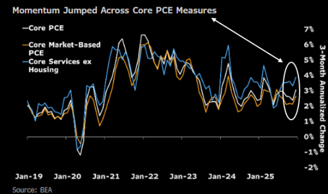 - December PCE: The prior month’s PCE data also came in firmer than expected. Both headline and core rose 0.4% month-over-month, marking the highest monthly core reading since February 2025. On a year-over-year basis, inflation moved back up to 3.0%. Shorter-term annualized trends have also accelerated, with the 1-, 3-, and 6-month annualized rates rising to 4.3% (vs. 2.0% prior), 3.1% (vs. 2.4% prior), and 2.9% (vs. 2.7% prior), respectively (see chart below). These momentum measures suggest inflation progress has stalled somewhat in recent months.