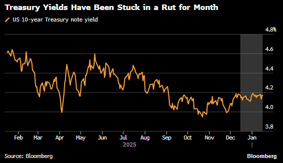 In contrast, the 10-year Treasury yield has remained surprisingly rangebound, rising just 0.2 basis points and trading within a narrow 4.1%–4.2% range since mid-December. This stability has persisted despite a series of significant headlines from the Trump administration, including: