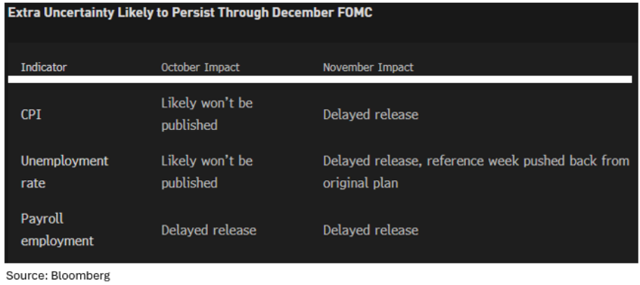 There is, however, considerable uncertainty surrounding both the October CPI and employment data. On the labor front, we will likely receive an October non-farm payrolls figure, as that data is collected electronically. In contrast, the unemployment rate may not be published because it relies on manually conducted phone surveys.